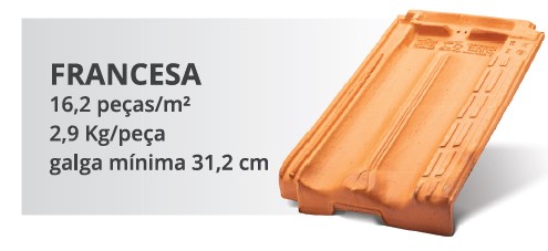 Peso: 2,7 kg Quantidade: 16,2 telhas/m² Galga Mínima: 31,2 cm |